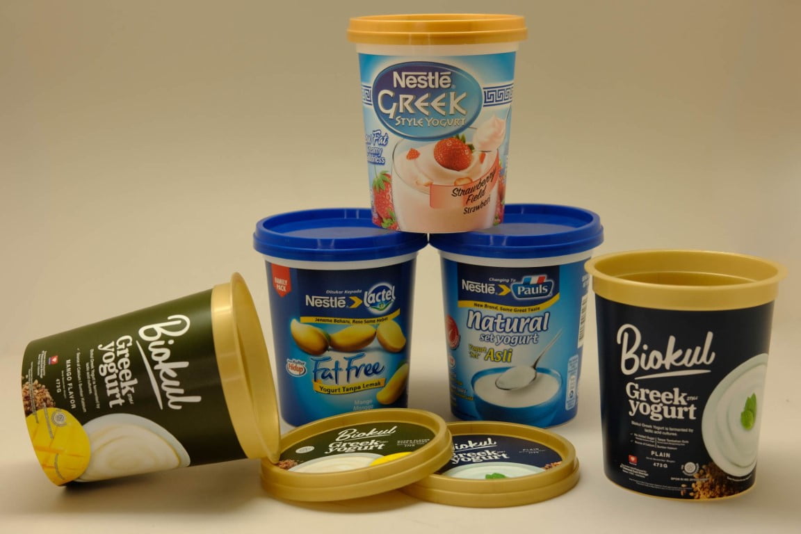 - Food containers, including yogurt cups, ice cream tubs, butter tubs, and takeaway packaging
